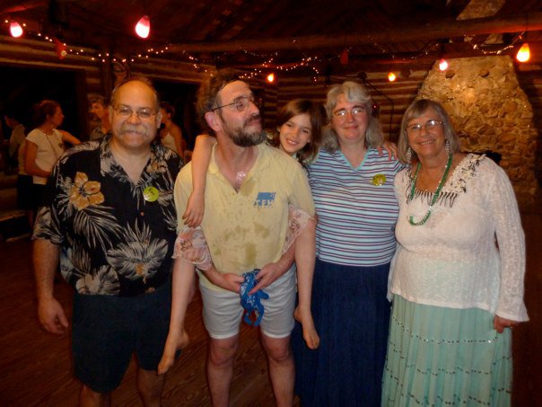 Ron B., JK, Ruth, Erin, Kathy A. 2011 01April: The caller at Vernal's 2011 (1–3, April) was Kathy Anderson. On Friday night, there was a session where guest-callers called no-walk-throughs, with fine music from Footloose. I called Lordags Waltz (challenging as a no-walk-through) and Chainsaw Reel, of which Dave Pokorney filmed a high-energy video. (L-to-R in photo: Ron Buchanon, JK, RK, EK, Kathy Anderson.)